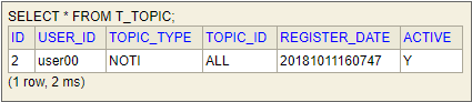 토픽이 등록되면 신뢰성 메시지를 수신할 수 있습니다. 데이터베이스 T_TOPIC 테이블에서 등록된 토픽을 확인할 수 있습니다.