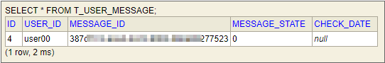 앱이 실행되지 않은 상태에서 메시지가 전송되면 해당 메시지는 데이터베이스 T_USER_MESSAGE 테이블에 저장됩니다. MESSAGE_STATE 컬럼값이 0이면 사용자에게 메시지가 전달되지 않은 상태입니다.