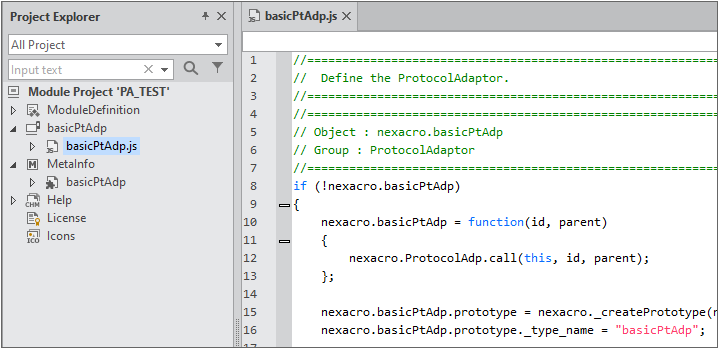프로젝트가 생성되고 basicPtAdp.js 파일이 편집창에 표시됩니다.