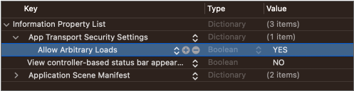 In case of setting the projectUrl and bootstrapUrl path as HTTP, select the Info.plist file, add "App Transport Security Settings," add "Allow Arbitrary Loads" underneath, and set the value to "YES."