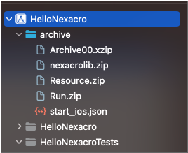 The files necessary for executing an app include modules, sources, resources, Run.zip and start_ios.json, which are all obtained through the Packing (Archive&Update) process of Nexacro Studio. If you load those files onto the "archive" folder in your Xcode project before building an app, you can run the app without a network connection.