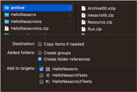 archive 폴더를 선택하고 폴더 추가 옵션에서 "Create folder references"을 선택 후 Add 버튼을 클릭합니다.