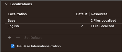 영어 이외의 언어를 지원하려면 [프로젝트 > Info > Localizations]에서 + 버튼을 눌러 다른 언어를 추가할 수 있습니다.