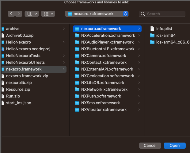 기본 라이브러리인 nexacro.xcframework는 필수 설정 대상이며 나머지 항목은 앱에서 사용하는 Device API에 따라 필요한 항목만 추가합니다.