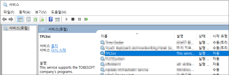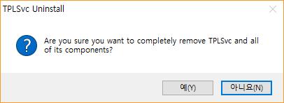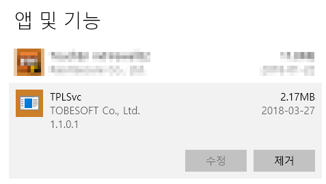 설치된 앱(프로그램) 목록에서 TPLSvc 항목을 찾아 [제거] 버튼을 클릭합니다.
