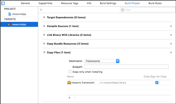 Build Phases - Copy Files’ 항목에서 프레임워크 추가