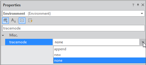 넥사크로 스튜디오에서 Environment 항목을 선택하고 tracemode를 변경합니다. 기본값 "none"인 경우에는 로그 기능을 처리하지 않으며 속성값을 "new" 또는 "append"로 설정하면 로그 파일을 생성합니다.