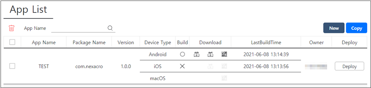 항목별로 빌드 상태와 빌드에 성공한 경우 설치 파일을 내려받을 수 있습니다. 항목을 선택한 후 오른쪽 상단 [Copy] 버튼을 클릭하면 "[App_Name]_copy"라는 이름으로 복사된 "App"을 생성합니다.