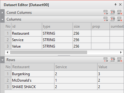 Enter the data item list in the created Dataset. If you double-click Dataset in the Invisible Objects area, then the Dataset Editor appears. Enter Columns and Rows as shown in the figure below.