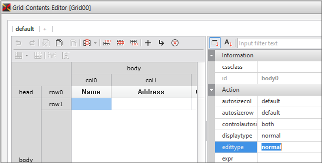 Cell is one of the objects that configure Grid and has separate properties from Grid. It can be used by binding the Dataset column, or by setting the displaytype, edittype properties of the cell, it can be expressed in the form of components such as Button, Combo, CheckBox, Image, ProgressBar, Edit, etc., or it can be expressed in the form of a tree.