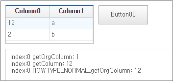 If you click the button after changing the value of the Dataset object bound to the Grid component, then the RowType value is changed and the changed state is displayed in the TextArea component. In the figure below, if you change the original value (1) to 12 and then change RowType to ROWTYPE_NORMAL, then you can see that the original value is changed to 12.