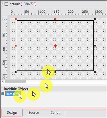 디자인 화면 내 아무 곳에나 마우스를 클릭합니다. Dataset 오브젝트는 화면에 표시되지 않기 때문에 배치된 위치는 아무 의미가 없습니다. 마우스를 클릭하면 [Invisible Object] 영역에 Dataset 오브젝트가 추가됩니다.