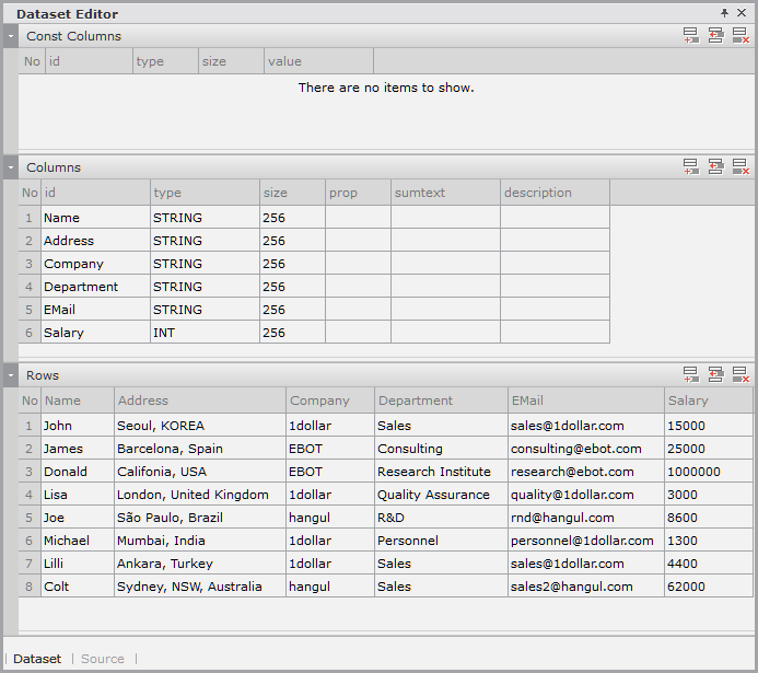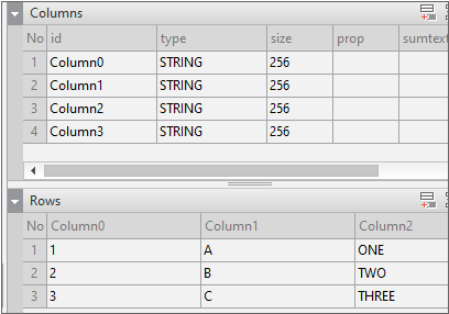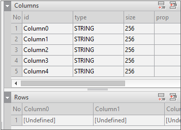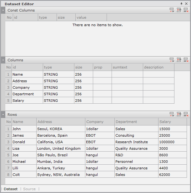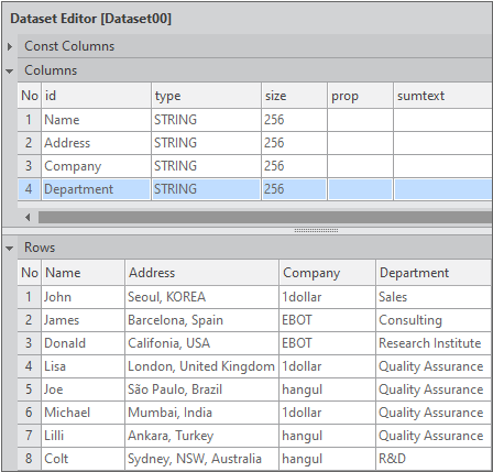 2. Enter the data item list in the created Dataset. If you double-click Dataset00 in the Invisible Objects area, then the Dataset Editor appears. Enter Columns and Rows as shown in the figure below.