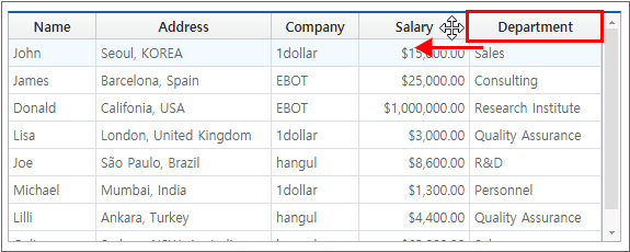 In the cellsizingtype property, the pointer changes when the user moves the mouse over the border of the Cell or Head, and the size of the cell can be changed by pressing and moving the mouse button. The cellsizingtype property can be set to none, col, row, or both. If you set it to col then you can only change the width; if you set it to row then you can only change the height. If set to both, then both width and height can be changed. If set to none, then cell size cannot be changed.