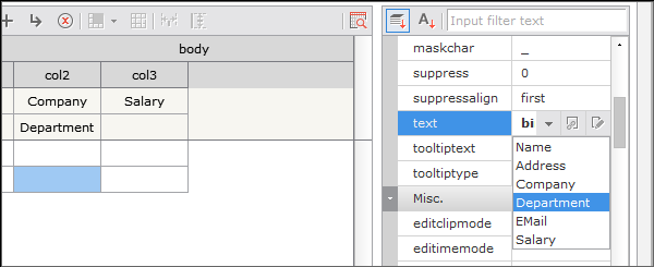 1. Select Cell of Body row3 corresponding to EMail, Department Column, and bind them to EMail, Department of Dataset according to each column.