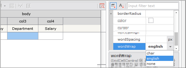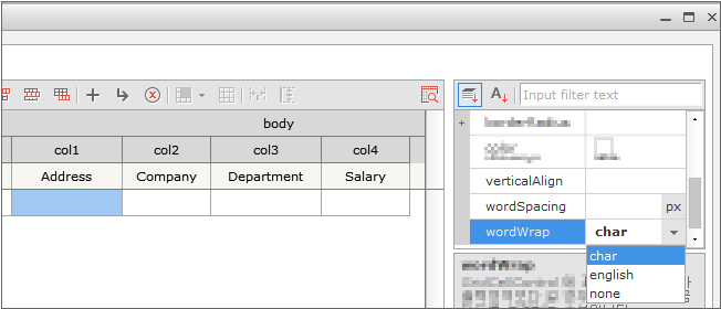 The automatic line break function looks different as follows depending on the setting of wordwrap. 1 is the case that the wordwrap property is set to char, and line break is applied to characters that exceed the width of Cell in the character unit. 2 is wordwrap the case that the wordwrap property is set to English, and line break is applied to characters that exceed the width of Cell in in the word unit.