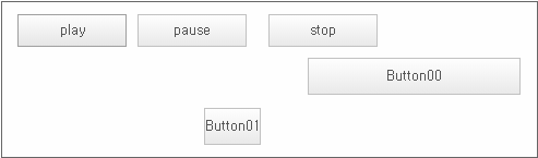 Apply animation effects to the Button00, Button01, Button02, Button03 components. When the [play] button is clicked, the animation effect is executed, and when the [pause] button is clicked, the animation effect is paused. Clicking the [stop] button returns to the initial state. Selecting the Radio button at the bottom changes the easing property value and the text of the Button component.