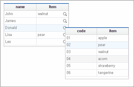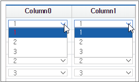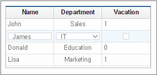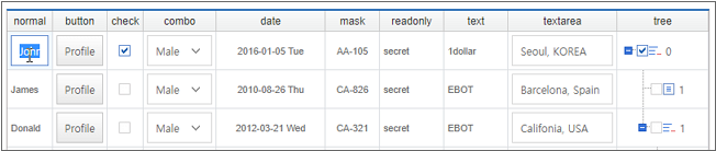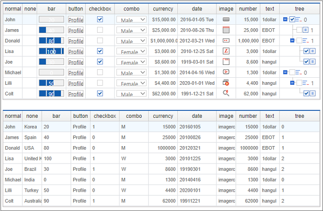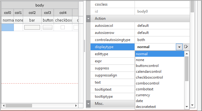 By comparing the two Grids, you can see how the data is represented according to the displaytype property setting of Cell.