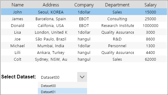 The following is an example of binding two Datasets, which are Dataset00, Dataset01, to Grid using the Select dataset combo box.
