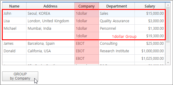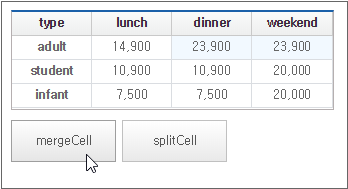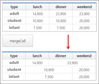 When the mergeCell button is clicked, adjacent cells with identical data are merged and displayed as a single cell.