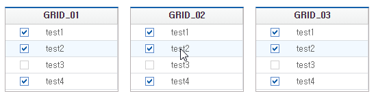 There are 3 Grid components merged in the same form, but each has different ways of processing checkboxes. The first Grid component does not react even when the checkbox area is selected, the second Grid component selects the checkbox when clicking anywhere in the cell area, and the third Grid component selects the checkbox when clicking the CheckBox control area.