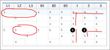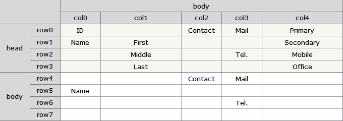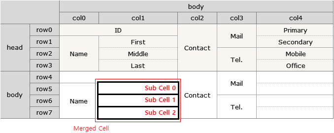 In the example, horizontally merged cells like First, Middle, and Last allow you to calculate subcell information using column values as shown below, but this doesn't work for vertically merged cells.