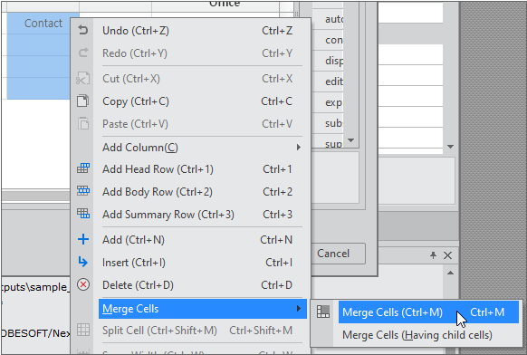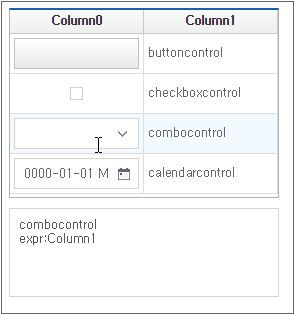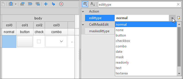 In the case of setting in the form of components such as combo, date, tree, etc. among several types, separate Cell properties must be set. Cell properties can be set in Grid Contents Editor. After selecting the corresponding Cell, detailed settings can be made in the GridCombo, GridDate, and GridTree categories in the Properties window.