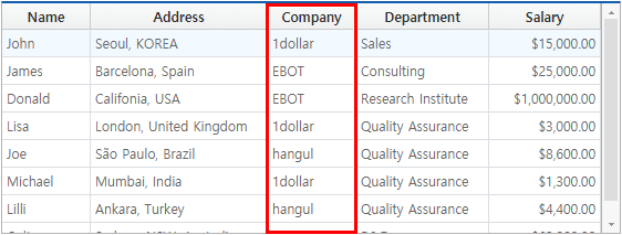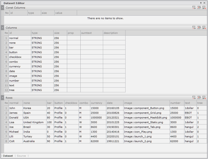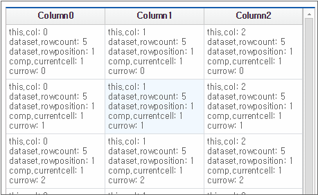 If you select the dataset from the Select dataset combo box, the corresponding Dataset is bound to Grid. Then, the createFormat method is executed, and the Grid format is created according to the Column structure of each Dataset. The format created after executing the createFormat method is immediately reflected in Grid.