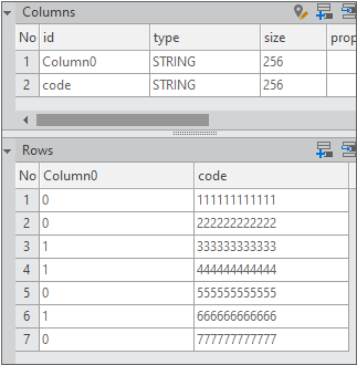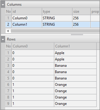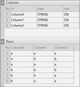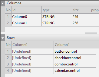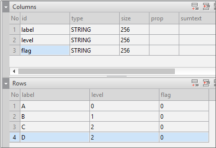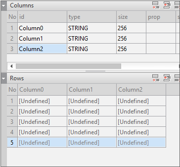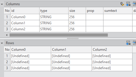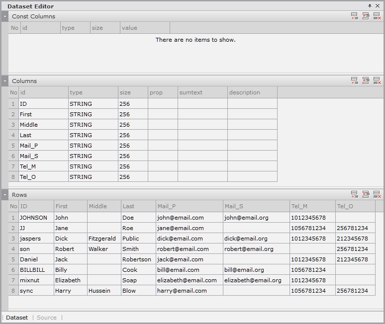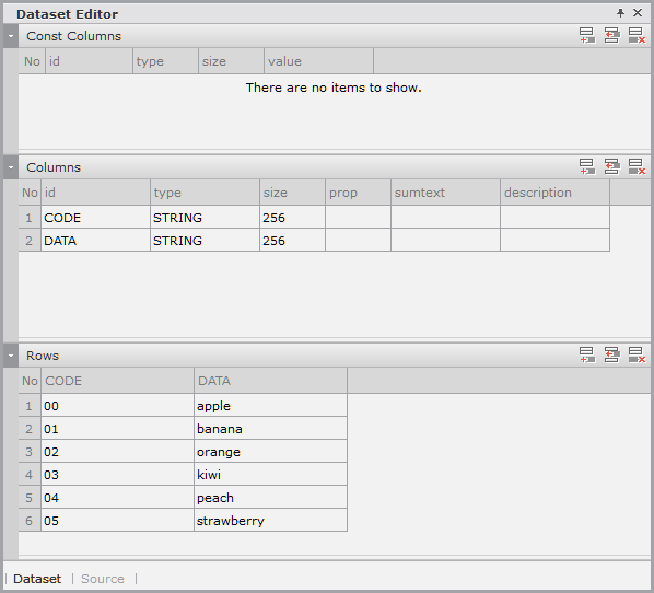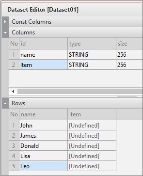 Enter the data item list in the created Dataset. If you double-click Dataset in the Invisible Objects area, then the Dataset Editor appears. Enter Columns and Rows as shown in the figure below.