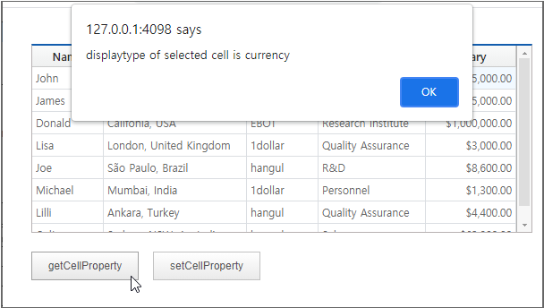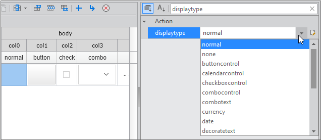 displaytype is the property that sets the format for displaying the contents of Cell on the screen. It can be set in the form of text such as normal, currency, date, number, text, etc., as well as the form of components such as combo, checkbox, button, tree, etc.