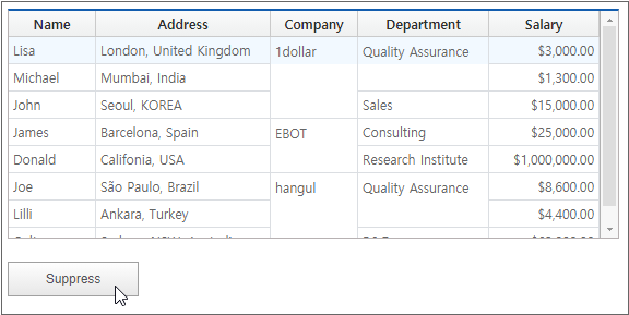 In the example for Displaying Cells of Selected Area as One Cell, the user manually merged selected cells into one, but in this example, adjacent cells with identical data are automatically merged and displayed as a single cell.