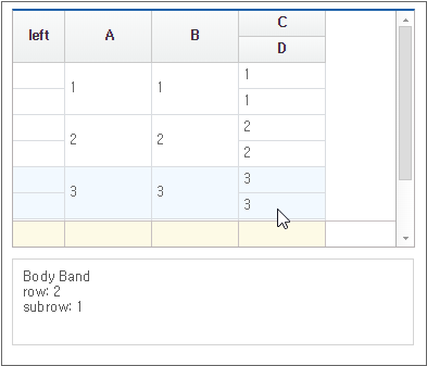 In the example on Setting Sub-cell Properties, we looked at how to retrieve information from merged cells. If you know the desired subcell index, you can retrieve the information using the getSubCellValue method, but when clicking a cell, the event object does not provide the subcell index. This example explores an alternative approach to retrieving data when a merged cell is clicked.