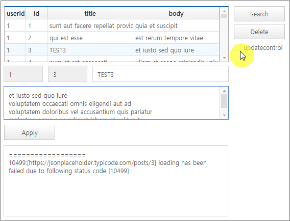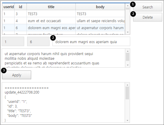Enter the event handler function to execute the applyChange method when the [Apply] button is clicked to handle the changed state after data is edited or deleted.