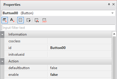 When the default value of the component is modified, the property value is displayed in bold font. The property values of id, text, left, top, width, and height are displayed in the bold font when they are first placed on the design screen. This is because the id, text property values are specified in the process of placing the component, and Position-related property values are specified according to the placed location.