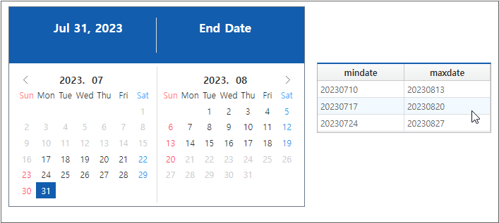 Select the mindate and maxdate property values in the table on the right, and the dates outside the specified range will not be available for selection.