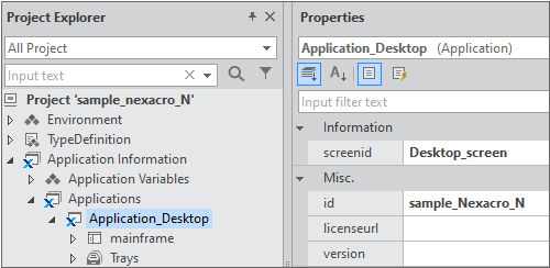 프로젝트 생성 시 "Application" 프로젝트를 선택했다면 프로젝트를 생성하면서 기본 Application을 생성합니다. 생성된 Application은 [Project Explorer > Application Information] 항목에서 확인할 수 있습니다. 해당 항목을 선택하고 관련 속성을 수정할 수 있습니다.
