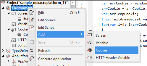 쿠키값이 표시되지 않는 경우에는 임시로 쿠키값을 설정해봅니다. Project Explorer에서 Environment 항목을 선택하고 컨텍스트 메뉴에서 [Add > Cookie] 항목을 선택합니다.