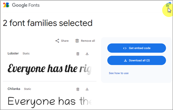 선택한 폰트는 오른쪽 상단에 장바구니 아이콘을 클릭하면 확인할 수 있습니다.