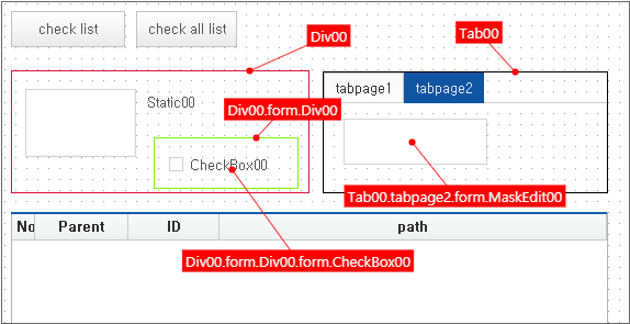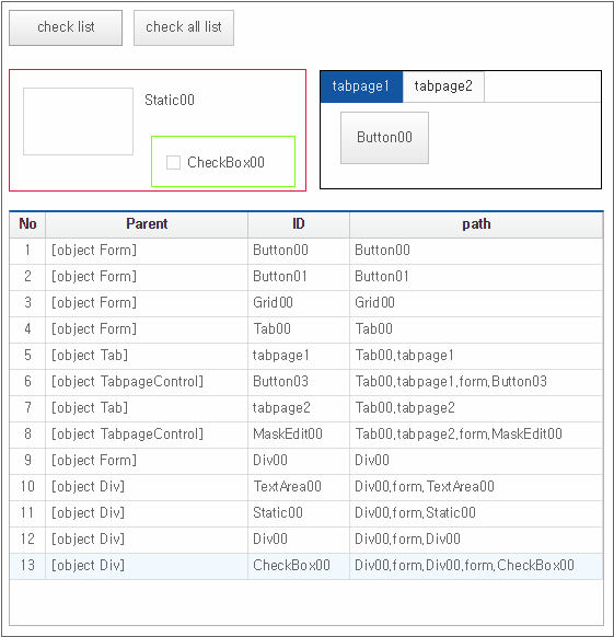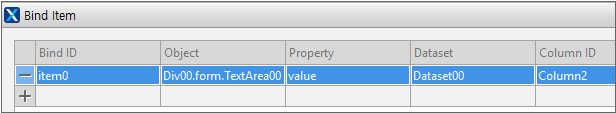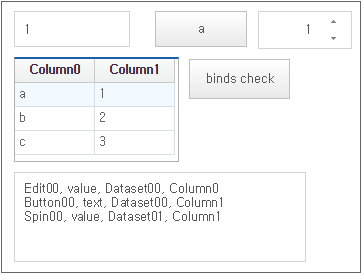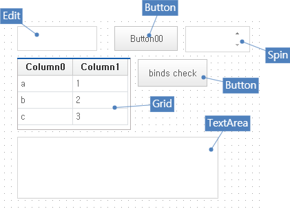 [binds check] 버튼을 클릭하면 Form 오브젝트 내에서 Bind 아이템 목록을 TextArea 컴포넌트에 표시합니다. Grid 컴포넌트처럼 binddataset 속성에 직접 바인딩 설정을 하는 컴포넌트는 표시하지 않습니다.