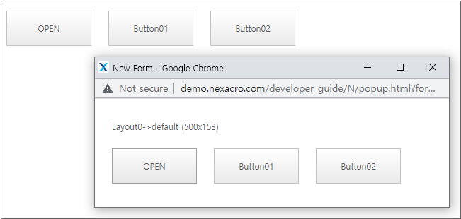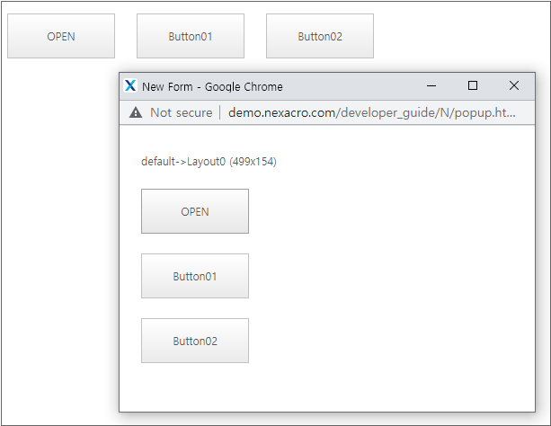 버튼 클릭 시 open 메소드를 사용해 같은 Form을 새 창으로 띄웁니다. 띄운 창의 모서리 부분을 마우스로 잡고 움직여 화면 크기를 줄이면 버튼의 배치가 바뀌는 것을 확인할 수 있습니다. 다시 화면 크기를 크게 조절하면 버튼의 배치가 바뀝니다.