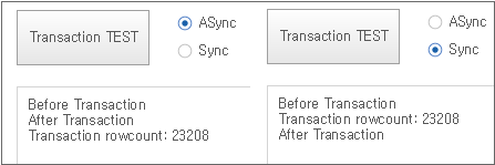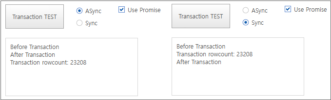 "Use Promise" 항목을 체크하고 선택한 동기화 여부 조건에 따라 "Before Transaction", "Transaction rowcount:", "After Transaction" 3개의 메시지가 보이는 순서가 달라집니다.