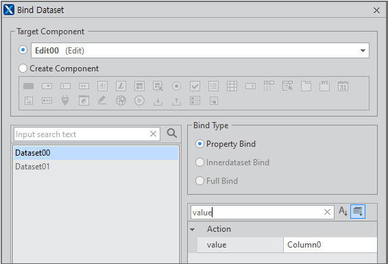 Bind Dataset 창에서 Target Component를 선택하고 속성을 찾아서 아래와 같이 값을 입력합니다.