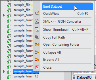Project Explorer에서 Form 오브젝트를 선택하고 컨텍스트 메뉴에서 [Bind Dataset]을 선택합니다.