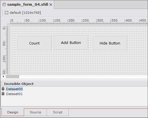 Form을 생성하면 넥사크로 스튜디오에서 생성된 Form을 열어줍니다. 열린 Form은 3가지 편집 모드를 제공합니다.