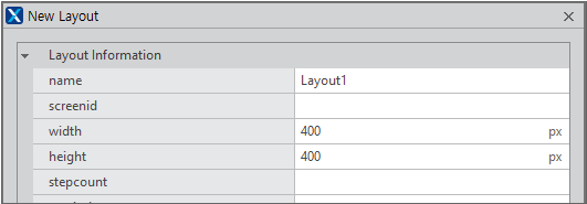 [Add Layout] 항목을 클릭하면 레이아웃 정보를 입력할 수 있는 [New Layout] 창이 나타납니다. 예제에서는 width, height 값만 입력합니다.