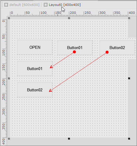 추가된 레이아웃을 선택하고 버튼 컴포넌트의 배치를 아래와 같이 수정합니다. 레이아웃을 선택하면 해당 레이아웃의 width, height 설정값에 따라 [Design] 모드에 보이는 Form 크기가 변경됩니다.