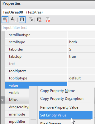 TextArea 컴포넌트를 선택하고 속성창에서 해당 값을 빈값으로 설정합니다. value 속성항목을 선택하고 컨텍스트 메뉴에서 [Set Empty Value]를 선택합니다.