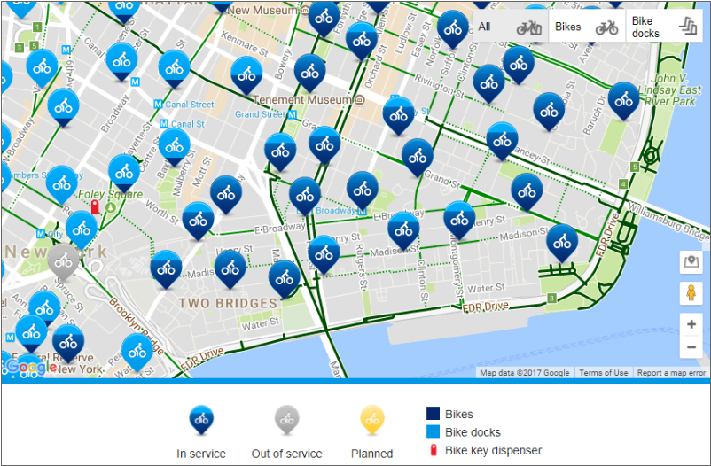다음은 Citi Bike 라는 구글 지도를 이용한 자전거 대여 서비스의 화면입니다. 지도상에 자전거를 대여할 수 있는 위치와 대여 가능 상태를 마커로 표시해 주어 사용자가 지도만 보고도 정보를 파악할 수 있습니다.