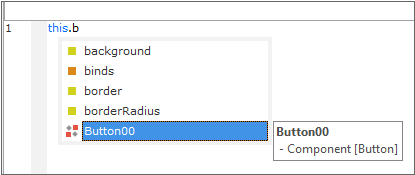 "this"라는 텍스트 입력 후 "."을 입력하면 Form 오브젝트의 속성, 메소드, 이벤트와 함께 배치된 컴포넌트의 목록을 보여줍니다. "." 입력 후 입력되는 글자에 따라 표시되는 목록을 필터링해서 보여줍니다. 목록에서 원하는 컴포넌트를 선택합니다.