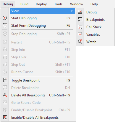 디버깅 모드는 Debug 메뉴에서 [Start Debugging] 혹은 [Start Form Debugging]을 선택하여 실행할 수 있습니다. [Start Debugging]은 프로젝트 전체를, [Start Form Debugging] 현재 오픈된 폼만을 실행할 때 사용합니다.